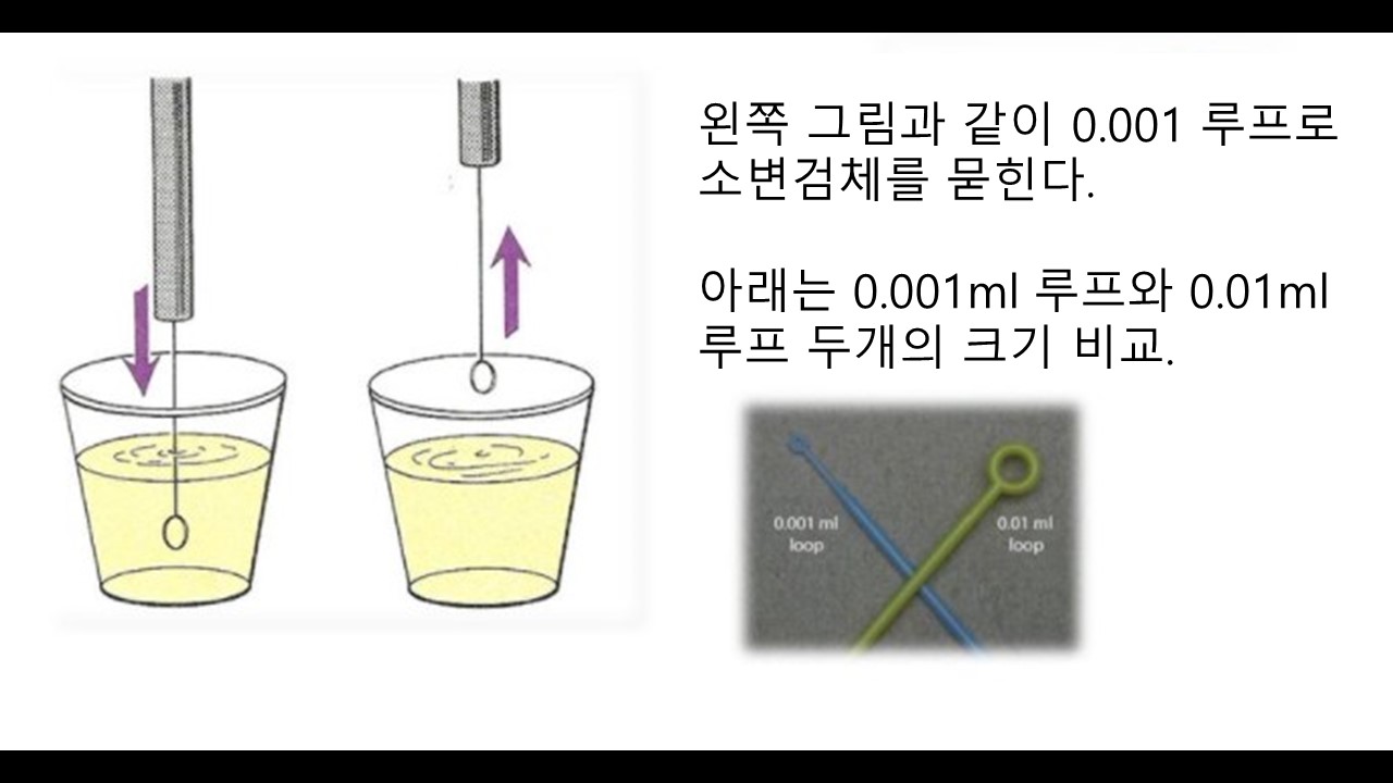우선 환자의 소변검체에서 루프를 사용하여 소변검체 일부를 추출하는데, 이때 채취되는 소변양이 약 0.001ml 로 되는 루프를 쓴다. (경우에 따라서는 0.01ml 루프도 있다.)